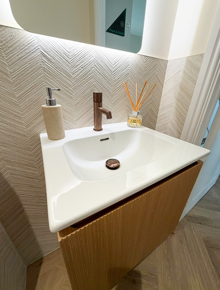 A striking fluted wooden vanity unit adds depth and character, combining natural texture with contemporary design for a sophisticated, high-end look.