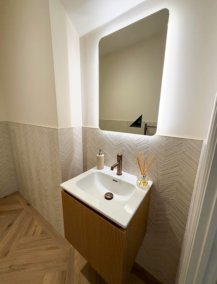 An integrated LED mirror provides gentle, flattering illumination while enhancing the sense of space—perfect for both practicality and atmosphere.