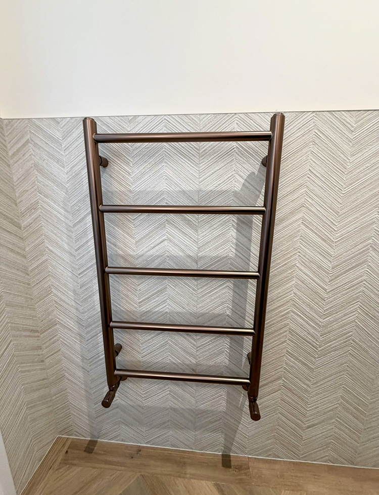 Rich Havana herringbone tiles bring warmth, texture, and visual interest to the space, creating a bold yet timeless foundation that elevates this compact room.
